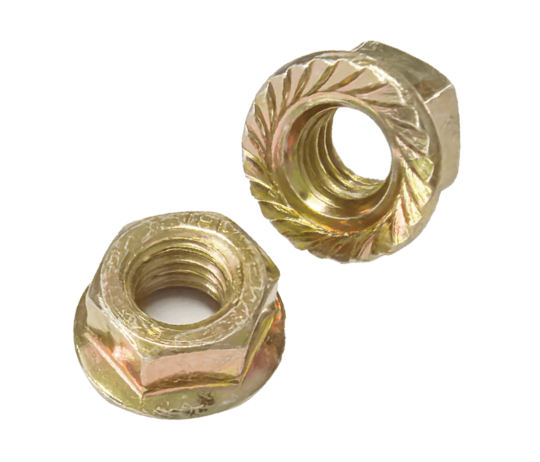 Flange works like a washer to distribute the load. Serrations can help grip the material surface and prevent the nuts from loosening due to vibration.